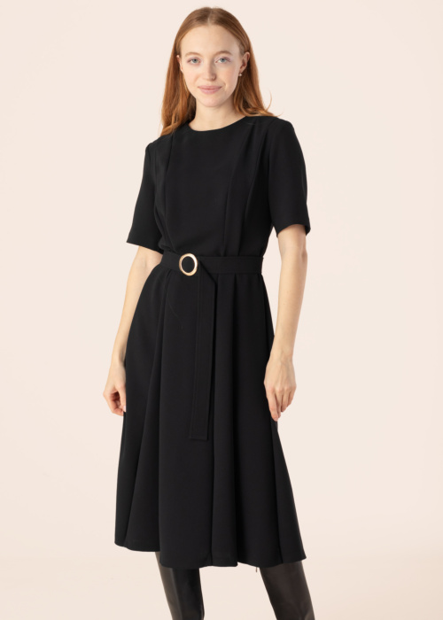 Althea sieviešu kleita Beate ir eleganta un pieticīga, vienmēr aktuāla izvēle, kas izceļ vidukli un piešķir īpašu šarmu valkātājai. Kleitas plīvojošais dizains un rāvējslēdzējs aizmugurē nodrošina komfortu un praktiskumu, savukārt josta ar sprādzi viduklī piešķir papildu akcentu. Šī kleita ir lieliska izvēle ikvienai, kas novērtē klasiku, un modeles augums ir 174 cm, nēsājot 38. izmēru.
