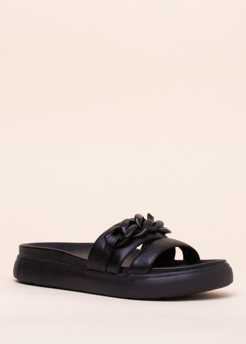 Virsma ir izgatavota no mākslīgās ādas un akcentu piešķir ķēdes dekorācija. Iekšpusi sienas oderē tekstils, bet iekšzoli, ar ērtu mīkstinājumu klāj mākslīgā āda. Ārzole no vieglas putuplasta gumijas, kas amortizē triecienus. Dodies jaunajā sezonā stilīgi!