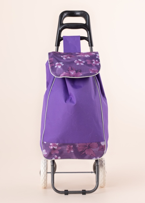 Baggage iepirkumu soma uz riteņiem padara iepirkšanos vieglu un ērtu! Lielā soma piestiprināta pie stipra, bet viegla metāla rāmja. Ar lieliem gumijas riteņiem un ērtu plastmasas rokturi vilkšanai. Soma ir ļoti ietilpīga un tā aiztaisāma ar auklām, kuras aizsedz liels atloks. Somas aizmugurē ir mazāka kabata ar rāvējslēdzēju, kurā droši novietot maku, atslēgas un citas nepieciešamās sīkākas lietas. Somas apakšējā mala un atloks ir dekorētas ar jauku ziedu rakstu. Uzticīgs palīgs visās situācijās! Izmēri: augstums 95 cm, platums 34 cm, pamatnes platums 27 cm. Krāsa: violeta / rakstaina.