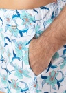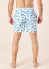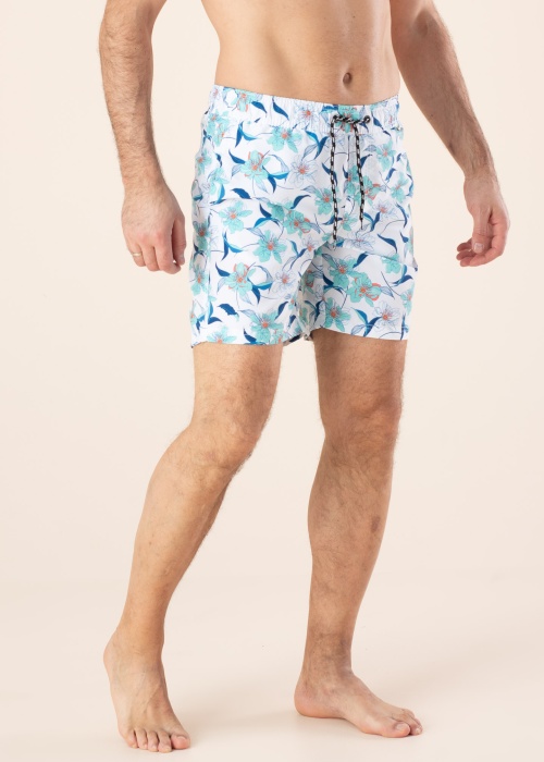 Plānas peldbikses ir ar ziedu rakstu un ar elastīgu jostasvietu. Sānos ir atvērtas kabatas , uz jostas ir tuneļa aukla un aizmugurē ir kabata ar klipsi. Iekšpusē plāna tīkliņauduma bikses. Foto: augums 188 cm valkā L izmēru.
