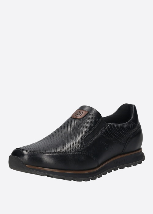 Bugatti vīriešu un brīvā laika apavi Cirino ir lieliska izvēle ikdienas valkāšanai, pateicoties to komfortam un praktiskumam. Apavi ir aprīkoti ar izteiksmīgu logo priekšpusē, kas piešķir tiem stilīgu izskatu. Sānos un sāna iekšpusē ir iestrādāti gumijas paneļi, kas nodrošina papildu izturību un ērtības. Virspusē esošais perforējums ļauj kājām elpot, padarot apavus piemērotus ilgstošai valkāšanai. Zīmola raksts sānos piešķir apaviem elegantu un atpazīstamu izskatu.