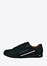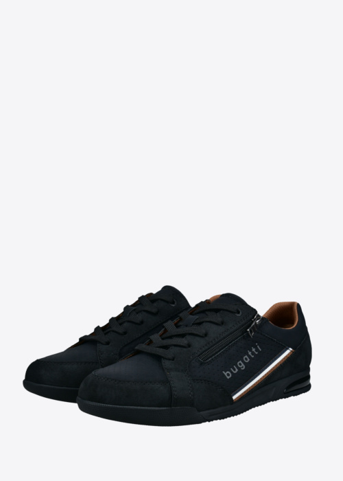 Bugatti vīriešu ikdienas apavi Trevor ir gaumīgi un labi iederas dažādās ikdienas situācijās. \nTiem ir zema zole, kas nodrošina vieglu soli un patīkamu sajūtu visas dienas garumā. \nMīksta iekšzole palīdz samazināt slodzi pēdām un uzlabo valkāšanas komfortu garākās pastaigās. \nVirspusē ir perforācija, kas veicina gaisa apmaiņu, bet sānos redzams zīmola raksts. \nPraktiskumam apavos ir sānu rāvējslēdzējs, savukārt šņores ļauj tos cieši un droši pielāgot pēdai.