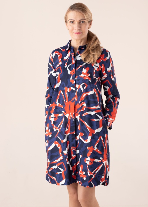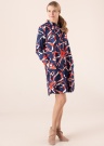 Stilīga Bugatti kleita sniedz pārliecības sajūtu. Dinamiska un ar atlokāmu apkakli kleita ir plāna un ar brīvāka piegriezuma. Priekšpusē ir pogu aizdare , sānos ir atvērtas kabatas un sānos ir šķēlumi. Šarmu piešķir rotaļīgs raksts. Foto: augums 178 cm valkā 36 izmēru.