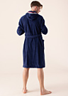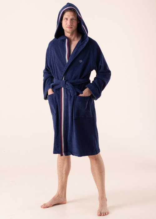 Bugatti zīmola peldmētelis Decimo vīriešiem ar krāsainu malu sniedz sportisku, jauneklīgu stilu. Ar kvalitatīvu kokvilnu un patīkami mīkstu, austu frotē virsmu tas ir ērts pavadonis gan no rīta, gan vakarā, gan spa dienā. Viduklis ar jostu, priekšpusē ietilpīgas, atvērtas kabatas. Modelis ir 193 cm garš, valkā L izmēru. Kopējais garums šim izmēram ir 113 cm.