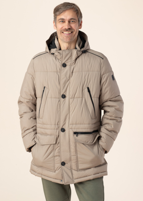 Bugatti vīriešu ziemas virsjaka ir lieliska izvēle aukstajiem mēnešiem, nodrošinot siltumu un komfortu jebkurā situācijā. Jakai ir noņemama kapuce un rāvējslēdzējs priekšpusē, kas padara to viegli lietojamu un pielāgojamu. Priekšpusē esošās kabatas ar spiedpogām un elastīgā gumija iekšpusē piešķir praktiskumu un papildu komfortu. Modelis, kura augums ir 195 cm, valkā 52. izmēru, kas apliecina jakas piemērotību dažādiem augumiem.