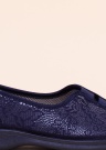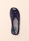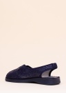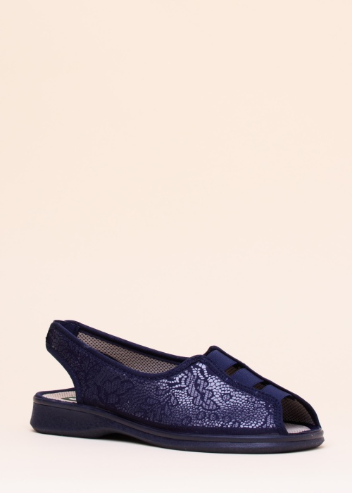 Ļoti ērtas Campello zīmola kurpes, kuru virsējā un iekšējā apdare no tekstila. Virspusi rotā ziedu motīvs. Papēža daļā un priekšpusē gumijas ielaidumi, padarot apava uzvilkšanu/ novilkšanu ērtāku. Ārzole no sintētiska materiāla. Svars 40. izmēram ir 262 g. Krāsa: zila