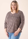Pievienojiet rakstu un krāsas ikdienas drēbēm ar Ciso mīksto un elastīgo blūzi. Kakla priekšpusē ir dizaina pogas, un apakšējā malā ir plāna gumija, kas nodrošina apjomu uzglabāšanai. Modelis ir 164 cm garš un valkā L izmēru. Materiāls: 95% viskoze, 5%elastāns. Krāsa: bēša / melna / krāsaina / rakstaina