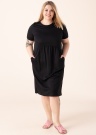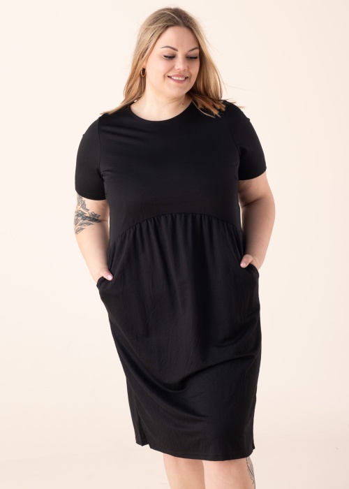 Šī Ciso kleita ar īsām piedurknēm ir patiesi ērts apģērbs, ko valkāt gan darbā, gan atpūtā! Kleita ar maigi mirdzoša auduma kleita aizdarāma ar pogu uz apkakle uz muguras un moderns krūšu daļas piegriezums rada apģērbam raksturīgu formu un atturīgu kopskatu. Sānos atvērta dizaina kabatas. Modeles augums 167 cm, valkā 38. izmēru. Dotā izmēra kleitas garums no apkakles līdz apakšmalai ir 106 cm. Materiāls: viskoze 60%, poliamīds 40% Krāsa: melna