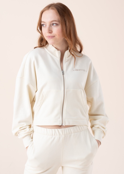 Stilīgā Converse jaka ir jauks apģērbs, ko valkāt brīvajā laikā! Priekšpusē jaka aizdarāma ar rāvējslēdzēju. Īsāka piegriezuma jakas priekšpusē atrodas ķengura stila kabatas, kreisajā krūtī atrodas izšūts zīmola logotips. Elastīgā gumija apakšmalas muguras daļā piešķir apģērbam skaistu noturību. Piedurknes ar valnīšiem ērti turas ap roku. Mīksts audums ar vieglu elastību ir patiesi patīkams. Modeles augums 174 cm, valkā S izmēru. Materiāls: kokvilna 80%, poliesters 20%. Krāsa: dabīgi balta.