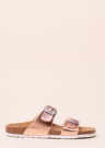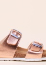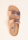 Patiesi ērtas Cosmos siksnveida sandales, kuru sievišķību uzsvērta, izmantojot spīdigo rozā virsmu. Siksnas var pielāgot kājai ar sprādzes palīdzību pēdas virspusē. Sintētiskā materiāla sandaļu iekšējā virsmā filca veida mīksts, kājai tīkams tekstila oderējums. Iekšējā zole anatomiska, balsta pēdu, ar mīkstinājumu, iedobuma veida iekšzole klāta ar zamšādas virsmu, valkājot sandales, nodrošinot komfortu. Korķa materiāla starpzole nodrošina dabisku mīkstumu, zolē ir izmantots sintētisks, ļoti lokans materiāls. Zoles biezums ir 2 cm. 39. izmēra sandale sver 200g. Krāsa: Rozā