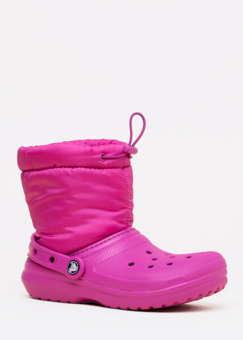 Viegli Crocs ziemas zābaki der valkāšanai ikdienā. Virsējā apdare kombinēta no tekstila un no sintētiska materiāla. Croslite materiāls ir ļoti viegls, izturīgs un antibakteriāls, tāpat Croslite materiāls īpaši pielāgojas pēdas formai. Gan iekšējo virsmu, gan zolīti klāj pūkains tekstilizstrādājums. Ārzole no gumijota, sintētiska materiāla, ar labu elastību pēdas daļā.