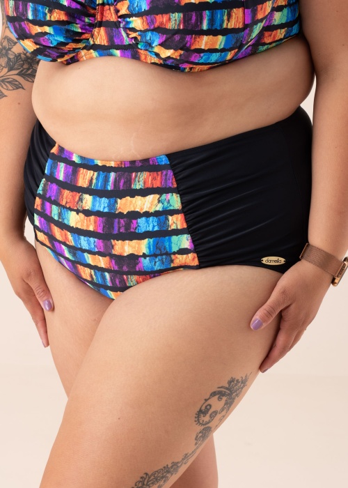 Jaukas, augstas jostasvietas Damella bikini apakšbikses Meryl ir lieliski piemērotas ikdienas valkāšanai. Priekšpuse ir dekorēta ar efektīgu daudzkrāsainu dizainu. Audums ir patīkami mīksts un tā elastība nodrošina komfortu ikdienas valkāšanā. Modelis ir 167 cm garš un valkā 46. izmēru. Materiāls: poliamīds 80%, elastāns 20%. Krāsa: melna/krāsaina.
