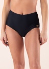 Damella bikini Nicole bikses ar paaugstinātu vidukļa daļu , no ērta elastīga materiāla atturīgā krāsā, ērti pielāgojas valkātājas figūrai. Augšmalu un kāju loku apmalo smalki elastīgas gumijas, bet kreisajā gurnā ir metāliska zīmola etiķete. Modeles augums 186 cm, valkā 38. izmēru.