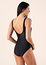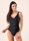 Sievišķīga Damella peldkostīms Julia ar vizuāli novājinošiem krokojumiem un vidukļa piegriezumu ir ļoti lipīga un ar krūšu spilveniem, kas komplimē krūškurvi. Modeles augums 176 cm, valkā 36. izmēru. Materiāls: neilons/poliamīds 80%, elastāns 20%. Krāsa: melna