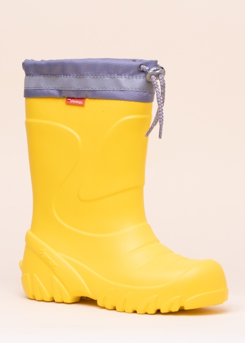 Vieglie Demar zīmola bērnu gumijas zābaki piemēroti valkāšanai jebkurā gadalaikā. Pateicoties savam 100% dabīgās aitas vilnas oderējumam, kas ir viegli noņemams ar līpklipša aizdari, gumijas zābaki valkājami gan siltā, lietainā vasaras dienā, gan aukstā ziemas dienā. Izgatavoti no patiesi vieglas gumijas, un aizdare ar auklu augšmalā palīdzēs novērst lietus un sniega iekļūšanu apavu iekšpusē. Piemēroti arī augstākai un platākai pēdai. Svars 34/35. izmēra zābakam ir 198 g.