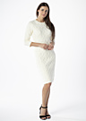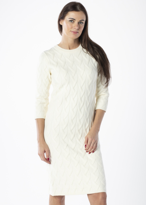 Denim Dream sieviešu kleita Emily02 ir skaists un stilīgs tērps, kas izceļ vidukli un piešķir eleganci. Kleitai ir apaļš kakla izgriezums un trīs ceturtdaļu piedurknes, kas padara to piemērotu dažādiem gadalaikiem. Tā ir adīta un silta, ar reljefu rakstu, kas piešķir tai unikālu izskatu. Valnīši uz apkakles, piedurkņu galiem un malas apakšā piešķir kleitai papildu šarmu. Modeles augums ir 176 cm un viņa valkā S izmēru.