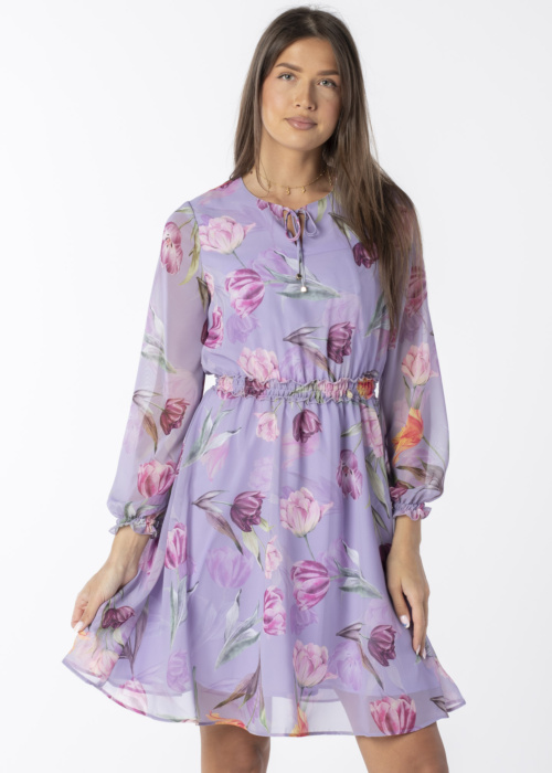 Denim Dream sieviešu svētku kleita Helle 10 ir sievišķīga un apburoša, ar ziedu rakstu, kas piešķir tai vieglumu un gaisīgumu. Kleita ir plīvojoša un jauka, ar elastīgu paneli viduklī un elastīgām piedurknēm, kas papildināta ar apburošu rišu. Priekšpusē ir sasienama josta, kas piešķir kleitai eleganci un izsmalcinātību. Modeles augums ir 178 cm un viņa valkā S izmēru.