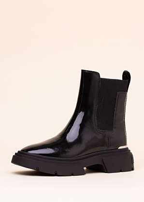 DKNY sieviešu puszābaki Fenella ir moderni un stilīgi apavi, kas noteikti piesaistīs uzmanību ar savu izteiksmīgo un masīvo dizainu. Šie spīdīgie puszābaki ir piemēroti dažādām situācijām, nodrošinot gan komfortu, gan eleganci. Papēdis ar dekoratīvu elementu un zīmola logotipu aizmugurē, kā arī gumijas panelis sānos piešķir apaviem unikālu un izsmalcinātu izskatu.