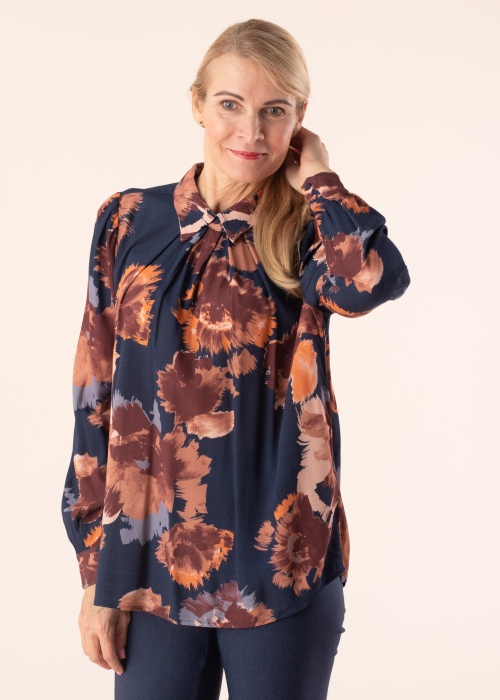 Gaisīgā Dranella blūze Banue ar skaistu, ziedu rakstainu virsmu ir lieliski piemērota sievietei, kura novērtē sievišķīgāku stilu. Apkakle ar stūriem, kas efektīvi nes oficiālu noskaņu, priekšpusē var aizvērt ar vienu diskrētu pogu. Piedruknes pieticīgi uzpūstas, izceļot valkātāja plecus. Izliektās malas aproču galos var aizvērt ar divām pieticīgām pogām. Blūze ir brīvi krītoša un pārvietojama kopā ar valkātāju. Modelis ir 178 cm garš un valkā S izmēru. Materiāls: 100% viskoze. Krāsa: krāsaina / rakstaina.