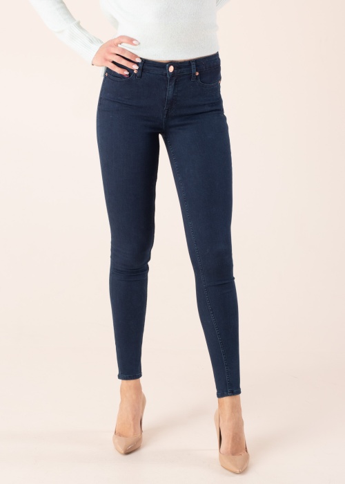 Stilīgie, tumši zilie Tommy Jeans džinsi ir ideāli piemēroti ikdienas valkāšanai. Piemēroti gan darbam, gan atpūtai. Vidēja augstuma jostasvieta ērti pieguļ valkātājas augumam, uz elastīgās jostasvietas ir arī jostas cilpas, kas ļauj bikses valkāt ar jostu. Modelim pavisam ir piecas kabatas, divas aizmugurē un trīs priekšpusē. Plānāks džinsa audums nodrošina lielisku maigumu un komfortablu kustību. Modeles augums: 178 cm, valkā 27-32. izmēru. Materiāls: kokvilna 91%, poliesteris 7%, elastāns 2%. Krāsa: tumši zila.