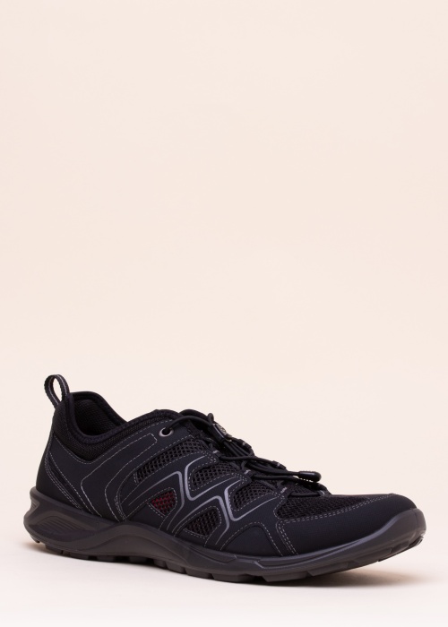 Vasarīgie Ecco apavi soļošanai ir viegli un patīkami gaisīgi. Augšdaļa ir apvienota ar caurspīdīgu tīkliņa veida audumu un izturīgu mākslīgo ādu, savukārt atstarojošās detaļas gan iekšpusē, gan ārpusē palīdz uzlabot redzamību tumšā laikā. Izšūtā zīmola uzraksts atrodas uz apavu mēles un aizmugurē, un apavus var nostiprināt augšpusē ar savilcēju. Iekšpuse ir izgatavota no elpojoša tekstilmateriāla, un maināmā zolīte ir polsterēta. Gumijas zolei ir laba elastība un izturība. Apavu svars 46. izmēram ir 364 g. Krāsa: melna