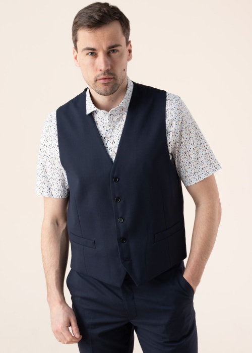Tīra stila Erla of Sweden veste pārstāv klasiku. Lietišķa veste ir labi pieguļoša un labi pieguļoša. Priekšpusē ir pogu aizdare un sānos atvērtas kabatas. Foto: augums 188 cm valkā 52 izmēru.