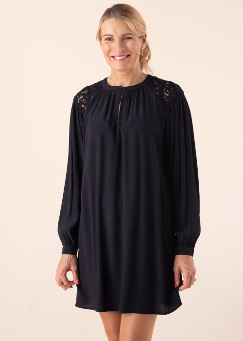 Pamanāma un minimālistiska Esprit svētku kleita ir ērta un stilīga. Kleita ir plāna, vijīga un ar pogu aizdari. Virs pleca mežģīnes un uz apkakles pogu aizdare. Ja mīli minimālistisku un ilgtspējīgu dizainu, tā ir perfekta izvēle! Modeles augums 178 cm, valkā S izmēru.