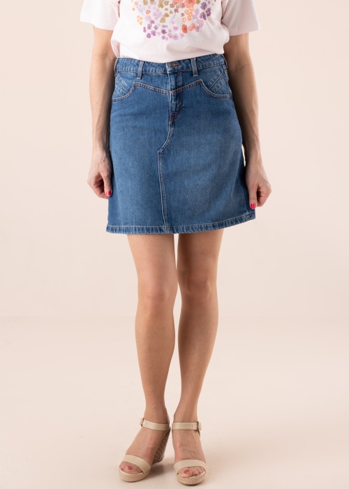 Jauki Esprit svārki der valkāšanai vasarā. No neelastīga denima svārki ir vienkārši un . Vidukļa dala aizdarāma ar pogu un rāvējslēdzēju, priekšpusē un aizmugurē ir atvērtas kabatas. Dizaina šuves priekšpusē un aizmugurē padara izteiksmīgāku. Foto: augums 178 cm valkā 27 izmēru.