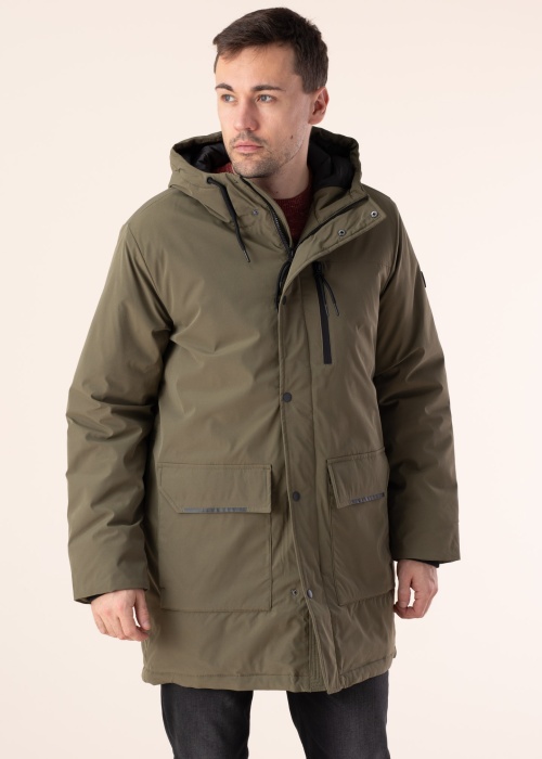 Moderna Esprit ziemas parka der valkāšanai ikdienā. Vīrišķīga ar matētu virsmu ziemas parka ir ar plānāku stilu un ūdens atgrūdoša. Priekšpusē ir aizdare ar rāvējslēdzēju un spiedpogām, kabatas sānos un krūšu daļā. Kapuce ir fiksēta un piedurkņu galos ir valnīši. Foto: augums 188 cm valkā L izmēru.
