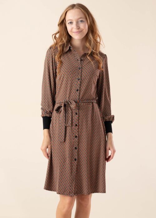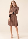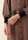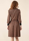 Pievilcīga EsQualo kleita izcels Tevi no pelēkās masas. Retrostils ar atlokāmu apkakli kleita ir ar interesantu rakstu brīvi krītoša un laba krituma. Priekšpusē ir pogu aizdare , viduklī sasienama josta un piedurkņu galos valnīši. Foto: augums 174 cm valkā S izmēru.