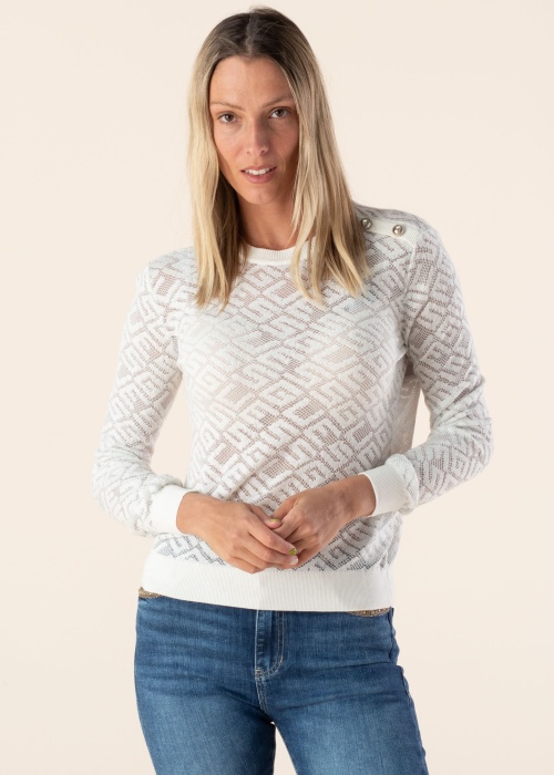 Jauneklīgs un romantisks Guess džemperis padarīs katru dienu īpašu. Plāns un mežģīņu džemperis ir ar apaļu kakla izgriezumu un ar daļēji pieguļošu piegriezumu. Akcentu piešķir zīmola raksts un piedurkņu galos un apakšmalā ir valnīši. Foto: augums 177 cm valkā S izmēru.