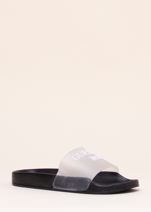 Brīnišķīgas, bērnišķīgas Guess zīmola iešļūcenes Amos ir radītas valkāšanai siltākā sezonā. Valkātāja pēdai pāri iet ar caurspīdīga, gumijota josla, kuru papildus rotā reljefs zīmola uzraksts. Iekšējās virsmas gumija veicina pēdas noturību, un iekšzole, kas nodrošina lielisku balstu , to veidojot, ņemta vērā pēdas anatomiskā formu, tādējādi, tā nodrošina lielisku balstu. Biezāka dizaina ārzole nodrošina lielisku saķeri gan ar sausām, gan mitrām virsmām. 34. izmēra svars ir 99 g.