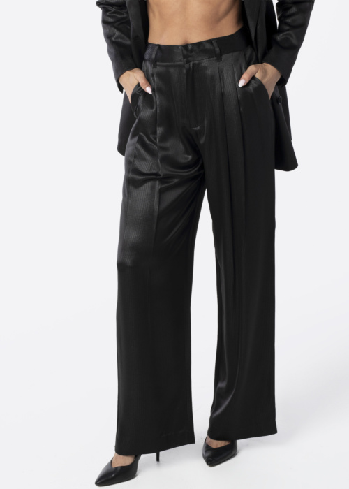 Guess sieviešu klasiskās bikses Jemma ir lieliska izvēle svinīgiem un formāliem pasākumiem. Tās ir labi pieguļošas ar platiem staru galiem, izgatavotas no izturīga un spīdīga auduma. Josta ir aizdarāma ar āķi un rāvējslēdzēju priekšpusē un sānos. Modeles augums ir 176 cm un viņa valkā S izmēru.