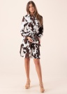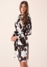 Guess kleita ar bagātīgu un pašpārliecinātu rakstu iekaro gan valkātāja, gan garāmgājēju sirdis! Apkakle aizdarāma ar pogām, vidusdaļā esošā auduma josta ļauj izveidot skaistu, sievišķīgu siluetu. Piedurkņu galos izvietotie šķēlumi aizdarāmi ar pogām, sānos izvietotie šķēlumi atvieglo kustību, kā arī piešķir kleitai personību. Kleitas iekšpusi papildina gaisīga poliestera odere. Zīdains kleitas audums ir patiesi mājīgs un patīkams. Apģērba izgatavošanā izmantotas pārstrādātas plastmasas pudeles. Modele ir 178 cm gara, valkā S izmēru. Kleitas garums no apkakles līdz apakšmalai 100 cm.