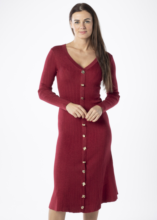 Guess sieviešu kleita Jelene ir eleganta un pievilcīga izvēle jebkurai sievietei. Kleita izceļas ar dekoltē un akcentētu vidukli, kas piešķir tai sievišķīgu un pievilcīgu siluetu. Tā ir adīta no elastīga materiāla, kas nodrošina komfortu un brīvību kustībās, un tās mirdzošais dizains piešķir īpašu šarmu. Priekšpusē esošā pogu aizdare piešķir kleitai papildu eleganci. Modeles augums ir 176 cm, un viņa valkā S izmēru.