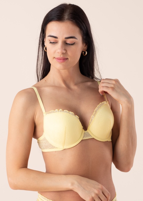 Skaista un sievišķīga dizaina Guess push-up krūšturis Arielle ar zīmola un sirsniņu rakstu. Krūšu grozi ar atbalsta lokiem ir ar stingru polsterējumu un no augšmalas rotāti ar mīlīgu apmali. Šauras plecu lences ir elastīgas un regulējamas, krūšturis aizmugurē aizdarāms ar divām āķu rindām. Modeles augums 176 cm, valkā 36B izmēru.