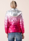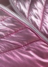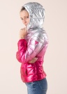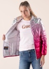 Guess pavasara - rudens virsjaka ar elegantu, uzmanību piesaistošu metālisku spīdumu ir lieliska izvēle sievietei, kura nebaidās piesaistīt uzmanību. Virsjakas augšdaļai ir izteiksmīga sudrabaina apdare, bet apakšdaļa ir metāliski rozā krāsā. Virsjaka ērti aiztaisāma priekšpusē ar rāvējslēdzēja aizdari, bet aizsardzību pret vēju un aukstumu nodrošina augstāka apkakle un noņemama kapuce ar rāvējslēdzēja aizdari un regulējamām auklām. Divas atvērtas kabatas sānos ir īpaši ērtas, lai sasildītu rokas. Iekšpuse ir pārklāta ar gludu oderējumu. Siltinājumam izmantota Thermore Ecodown Fibers tehnoloģija, kā rezultātā ir radīta gaisīga, silts, viegli kopjama virsjaka, kas saglabā formu valkāšanas laikā un ir izgatavota no 100% pārstrādātām šķiedrām. Modeles augums ir 177 cm, un tā valkā izmēru S. Garums no apkakles līdz apakšējai malai šajā izmērā ir 63 cm.
