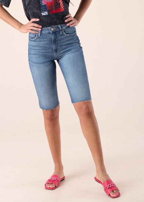 Guess pusgarās bikses ar šauru piegriezumu un augstāku vidukli ir lieliska izvēle, lai papildinātu savu vasaras garderobi! Nolietotajam džinsa audumam piemīt maiga elastība, kas lieliski pielāgojas valkātāja ķermenim, un piecu kabatu modelis ir nostiprināts ar klasisku pogu un rāvējslēdzēju. Aizmuguri rotā zīmola logotips labajā kabatā un ādas emblēma jostasvietā. Neapgrieztas kājas rada patiesi jauneklīgu un modernu izskatu! Modelis ir 178 cm garš un valkā 27. izmēru. Materiāls: kokvilna 94%, poliesters 5%, elastāns 1%. Krāsa: zila.