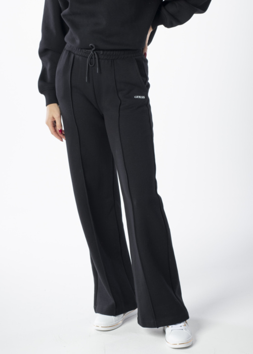 Guess sieviešu sporta bikses Nat ir lieliski piemērotas atpūtai, nodrošinot gan komfortu, gan stilu. Tām ir plati staru gali un siltināta iekšpuse, kas uztur patīkamu siltumu vēsākās dienās. Bikses ir aprīkotas ar elastīgu jostu un auklu, kas ļauj tās pielāgot pēc vajadzības, kā arī dizaina šuvi priekšpusē, kas piešķir tām unikālu izskatu. Zem kreisās kabatas ir zīmola uzraksts, kas papildina to ikdienas šarmu. Modele ir 176 cm gara un valkā S izmēru.