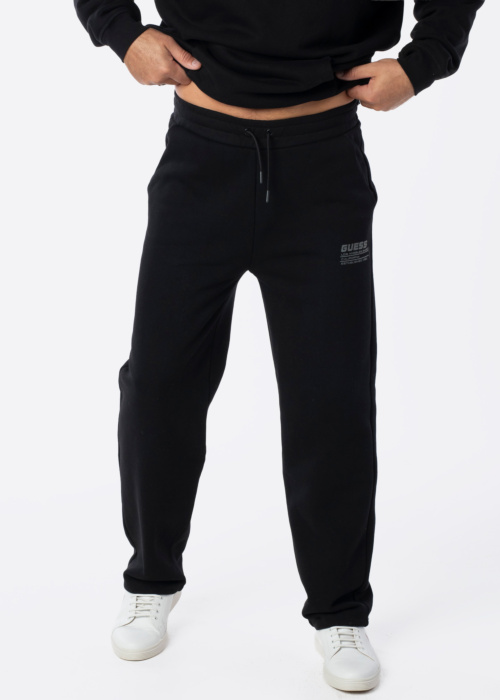 Guess vīriešu sporta bikses ir ļoti atpazīstamas un tām ir siltināta iekšpuse, kas nodrošina komfortu vēsākās dienās. Tās ir aprīkotas ar elastīgu jostu un auklu, lai tās varētu pielāgot, un taisni staru gali piešķir modernu izskatu. Zīmola logo ir izvietots zem kreisās kabatas. Modelis ir 188 cm garš un valkā L izmēru.
