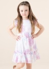 Meitenīga Guess kleita pateicoties skaistajam vizuālajam tēlam, sniedz svētku noskaņu. Jauka apaļš kakla izgriezums kleita ir ar apaļu kakla izgriezumu gaisīga un plīvojoša. Mugurpusē ir rāvējslēdzējs , viduklī gumija un piedurkņu galos un apakšmalā apburošas rišas. Iekšpusē ir apakškleita. Foto: augums 120 cm valkā 118 izmēru.