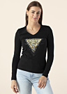 Guess sieviešu T-krekls Tiger ir lielisks ikdienas valkāšanai ar V-veida kakla izgriezumu, kas piešķir tam elegantu un vienkāršu izskatu. Šis krekls ir izgatavots no elastīga auduma, kas nodrošina komfortu visas dienas garumā, un to rotā izteiksmīgs drukas attēls un mirdzoši akmentiņi priekšpusē uz krūtīm. Modeles garums ir 176 cm un viņa valkā S izmēru.
