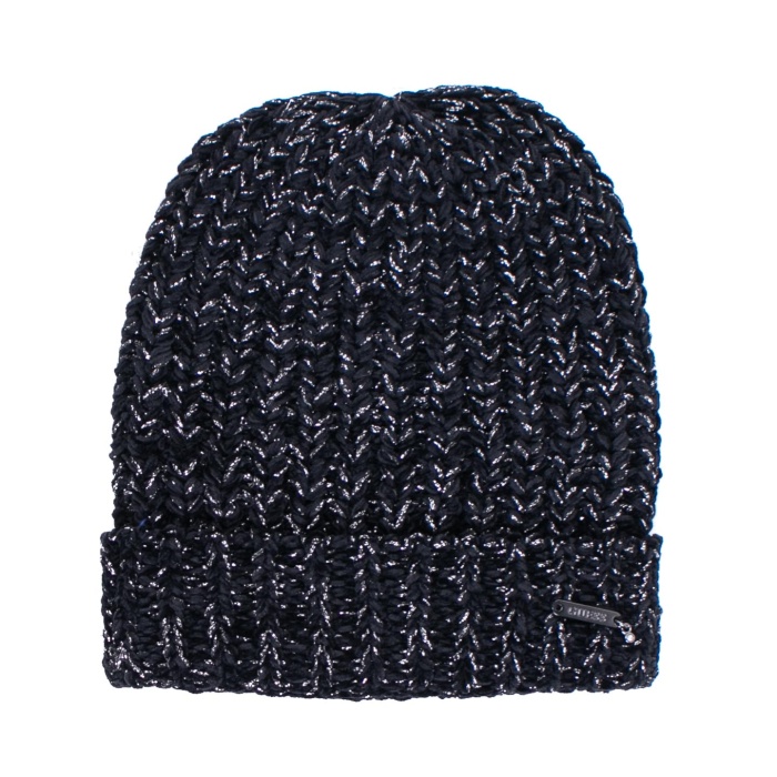 Mīlīga un mīksta Guess zīmola cepure ar uzlokamu malu, austiem sudraba diegiem un zīmola logotipu ar nelielu spīdīgu akmeni, kas pievienots priekšpusē.