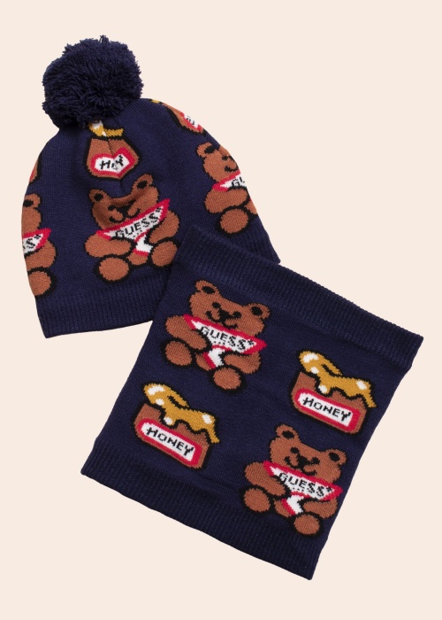 Šis jauks komplekts sastāv no šalles un cepures un būs brīnišķīga dāvana mazam zēnam. Šī mīkstā adīta cepure ar pomponu ir dekorēta ar lāču rakstu un zīmola logotipu, savukārt cauruļu šalli rotā medus podu raksts ar medu, lāčiem un zīmola logotipu. Mīksta, ērta odere iekšpusē. Materiāla sastāvs. Korpuss: viskoze 44%, poliesters 31%, poliamīds 24%, elastāns 1%. Iekšējā apdare: kokvilna 95%, elastāns 5%. Krāsa: tumši zila / rakstaina