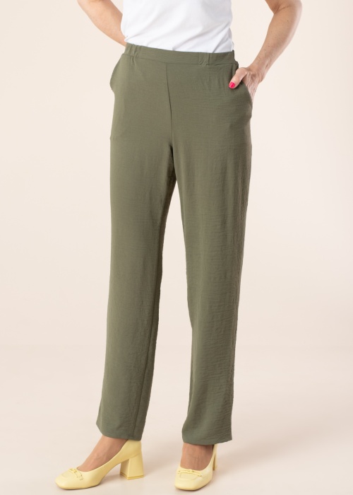 Tīra stila Hansmark bikses der valkāšanai vasarā. Ar plānāku stilu vieglas bikses ir ar paaugstinātu jostasvietu un ar taisnām starām. Uz jostas ir gumija un sānos atvērtas kabatas. Saskaņo ar dažādiem apģērbiem un radi jaunus stilus! Foto: augums 178 cm valkā 38 izmēru.