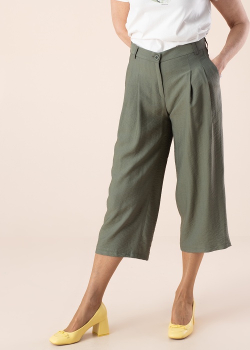 Modernas Hansmark bikses der stilu zinošai sievietei. Vasarīgas plānas bikses ir ar paaugstinātu jostasvietu un ar platiem staru galiem. Vidukļa daļa aizdarāma ar pogu un rāvējslēdzēju, sānos ir atvērtas kabatas. Izteiksmīga detaļa, ar kuru papildināt izvēlēto apģērbu! Foto: augums 178 cm valkā 38 izmēru.
