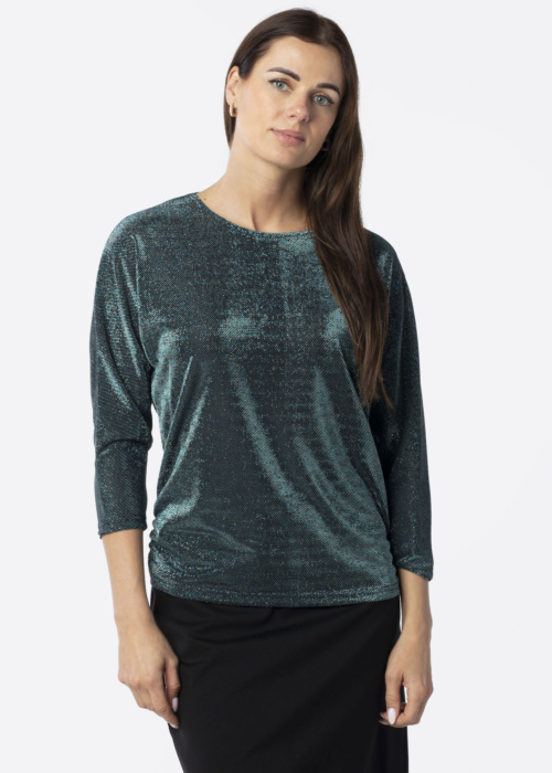 Hansmark sieviešu blūze Beili ir eleganta un iespaidīga izvēle, kas izceļas ar savu interesanto dizainu. Blūzei ir apaļš kakla izgriezums un caurspīdīgs, elastīgs audums, kas brīvi krīt un piešķir mirdzošu izskatu. Modele ir 176 cm gara un valkā 38. izmēru.