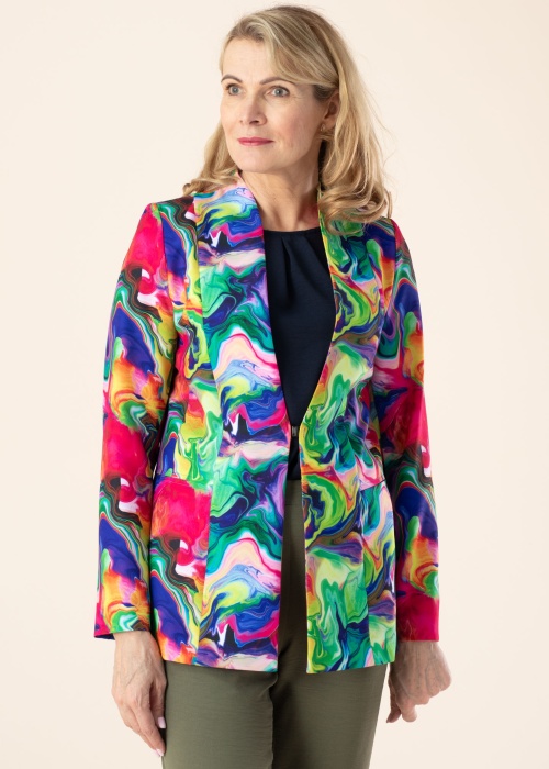 Sievišķīga Hansmark jaka pārstāv klasiku. Eleganta un ar patīkamu pieskārienu jaka ir ar garu piegriezumu. Priekšpusi nostiprina ar magnētisko spiedpogu un priekšpusē ir atvērtas kabatas. uz pleciem ir plecu spilventiņi , kā arī šarmu piešķir rotaļīgs raksts. Iekšpuse nav oderēta. Foto: augums 178 cm valkā 38 izmēru.