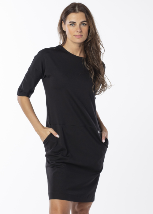 Hansmark sieviešu kleita Fare ir klasiska un eleganta, ar piedurknēm līdz elkonim un taisnu siluetu, kas piešķir izsmalcinātību jebkuram izskatam. Kleita ir elastīga un patīkama pieskārienam, kā arī ātri žūstoša, padarot to piemērotu gan ikdienas valkāšanai, gan svinīgiem pasākumiem. Modeles augums ir 176 cm, un viņa valkā 38. izmēru.