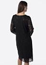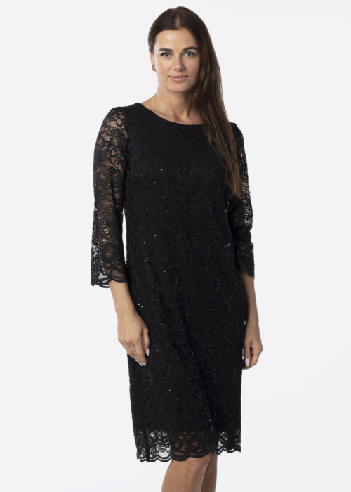Hansmark sieviešu kleita Pērle ir eleganta un pievilcīga, izceļot vidukli ar elastīgu piegriezumu. Kleita piesaista uzmanību ar savu skaisto dizainu, kurā ietilpst mežģīnes gan priekšpusē, gan aizmugurē, kā arī mežģīņu piedurknes un spīdīgi fliteri. Modeles augums ir 176 cm, un viņa valkā 38. izmēru.